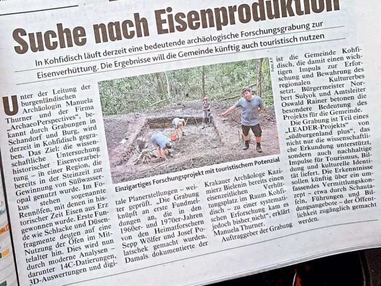 Um Spuren der Eisenverhüttung zu dokumentieren wurde in der Gemeinde Kohfidisch ein Grabungsschnitt von etwa 5x5 m angelegt. Dieser wurde auf Grund einer vorangegangenen geophysikalischen Prospektion (Magnetik) eingemessen und es konnte schon losgehen! Das Grabungsteam bestehend aus der Grabungsfirma ArchaeoPerspectives (www.archaeo-perspectives.at) und der Projektleiterin Manuela Thurner verbrachte 10 Tage damit das Geheimnis der "Eisenopale" zu lüften.